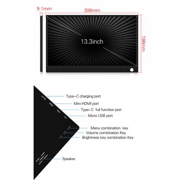 | Specification | * Display screen: 16:9 IPS 13.3-inch full view * Resolution: 1920*1080 * Multiple OSD Language * Support display (audio & video) for smartphone with USB 3.1 Type-C port * Support same or secondary screen display of Notebook and Desktop PC * Support connect with PS4, SWITCH and XBOX ONE by HDMI * Support most HDMI output devices, like digital camera, set-top box etc. * HDR display * Port: USB Type-C port*2 (one for data transfer, another for charging), micro USB port*1 (not available together with built-in battery), mini HDMI port * Button: menu, composite button*2 * Built-in stereo speakers * Power: all DC power PD protocol supports * Standard accessories: USB Type-C cable*2, HDMI cable, user manual, warranty card, magnetic leather case, generic gift box * Optional accessories: leather case with BT keyboard |